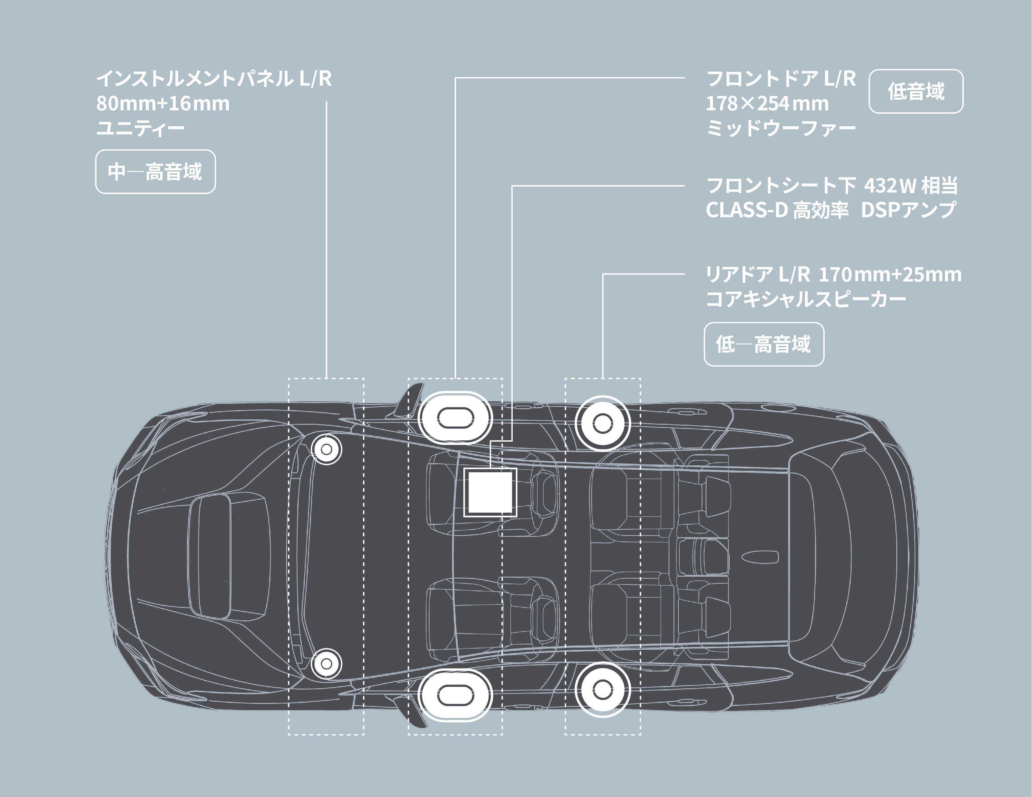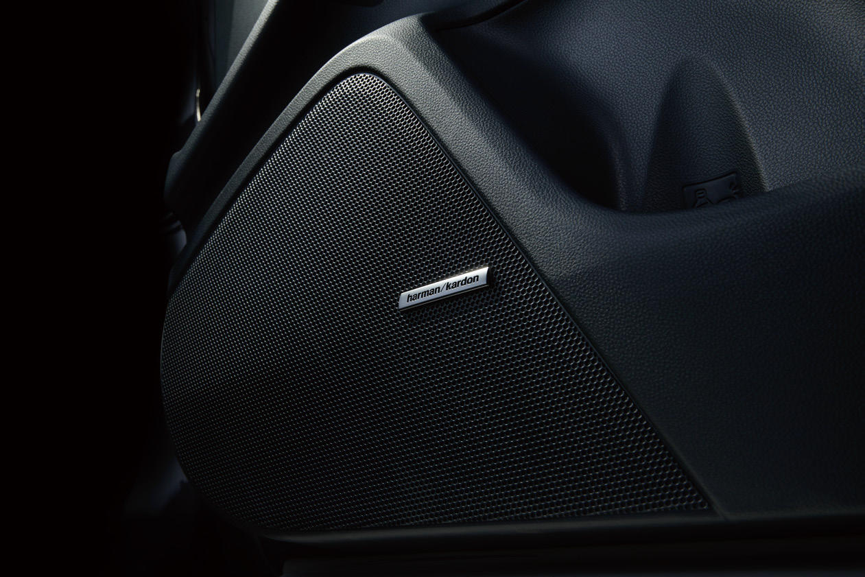 今回の新型車には、伝統ある世界的オーディオブランド、ハーマンカードンのサウンドシステムが採用されています。フロント6個のシステムではIPにツイーターとミッドレンジを一体化させた中高域ユニティー(同軸) スピーカーが採用されている他、リア4個、計10個のシステムにて構成されています。