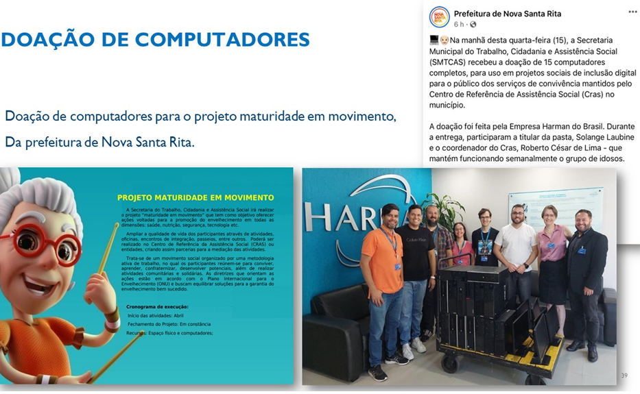 Foram doados 15 computadores para projetos sociais de inclusão digital em Nova Santa Rita, com o intuito de evitar o descarte de produtos eletrônicos que não seriam mais utilizados e ajudar a comunidade local.